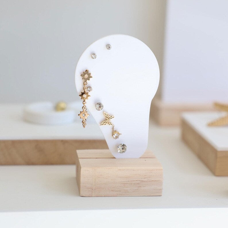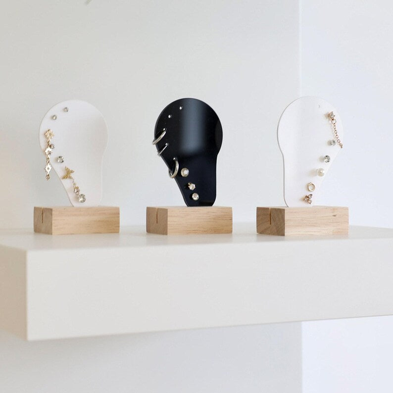 Suport Bijuterii "Ear Silhouette” – Organizator din Acril și Lemn pentru Modelarea Cerceilor