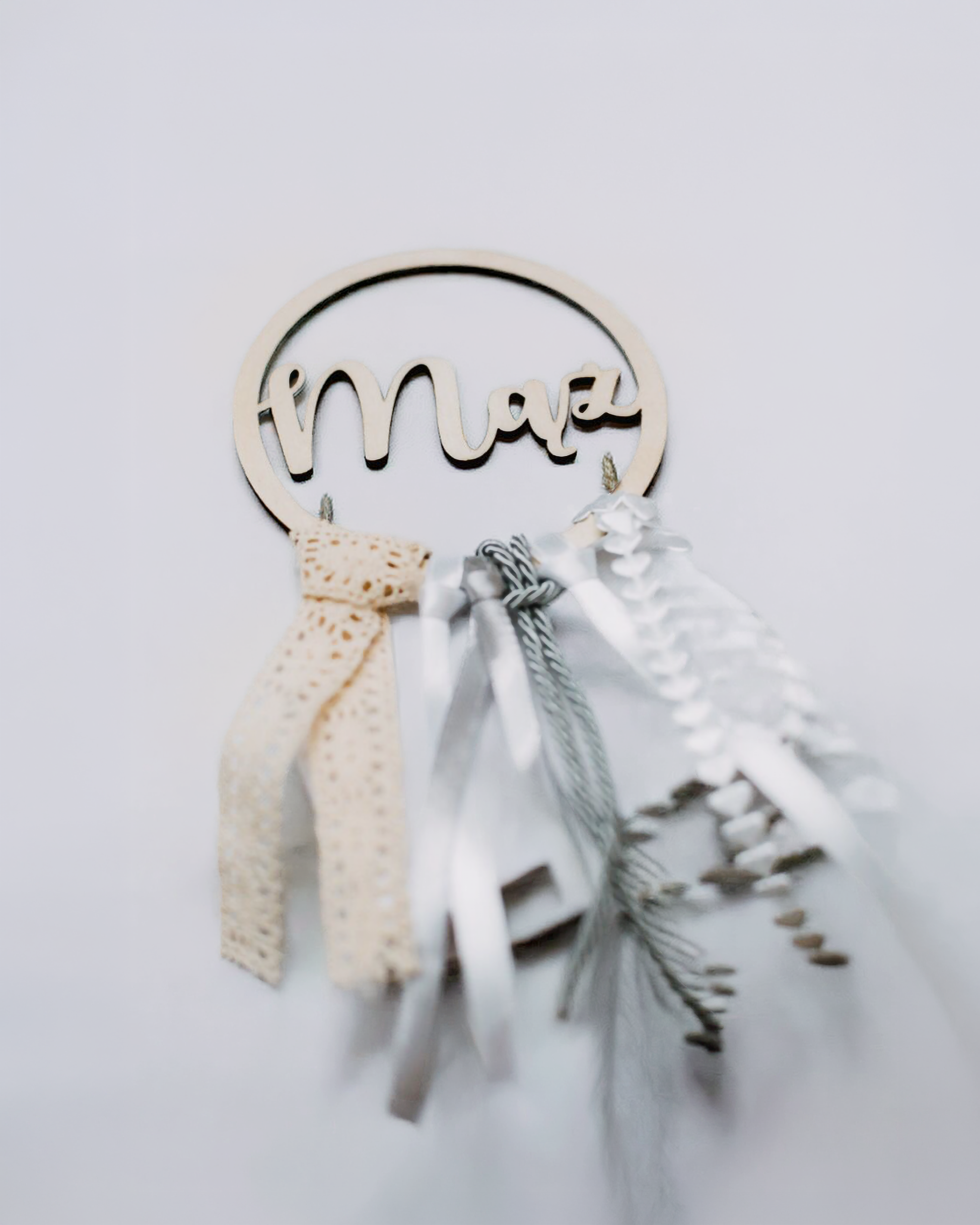 Place Card Personalizat "Boho Circle” – Nume din Lemn cu Panglici pentru Decor Masă Eveniment